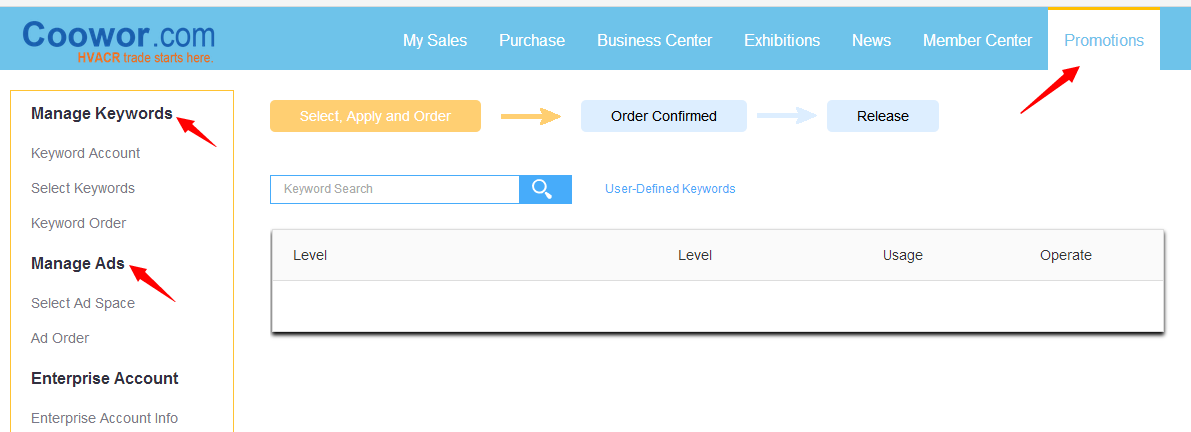 Manage Products: release your products. When the released products are reviewed by Coowor, buyers can find them by searching certain keywords.